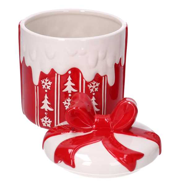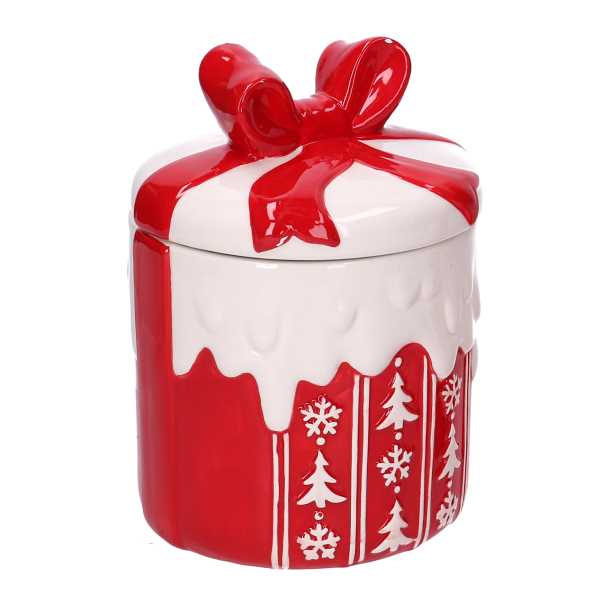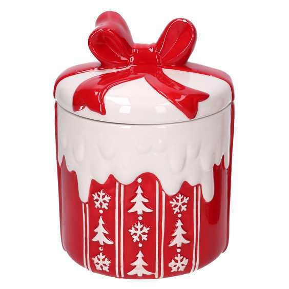 Barattolo ceramica pacco regalo con decori bianchi, tondo e di dimensioni cm ø13,5h18,5. Ideale come regalo per qualsiasi occasione.