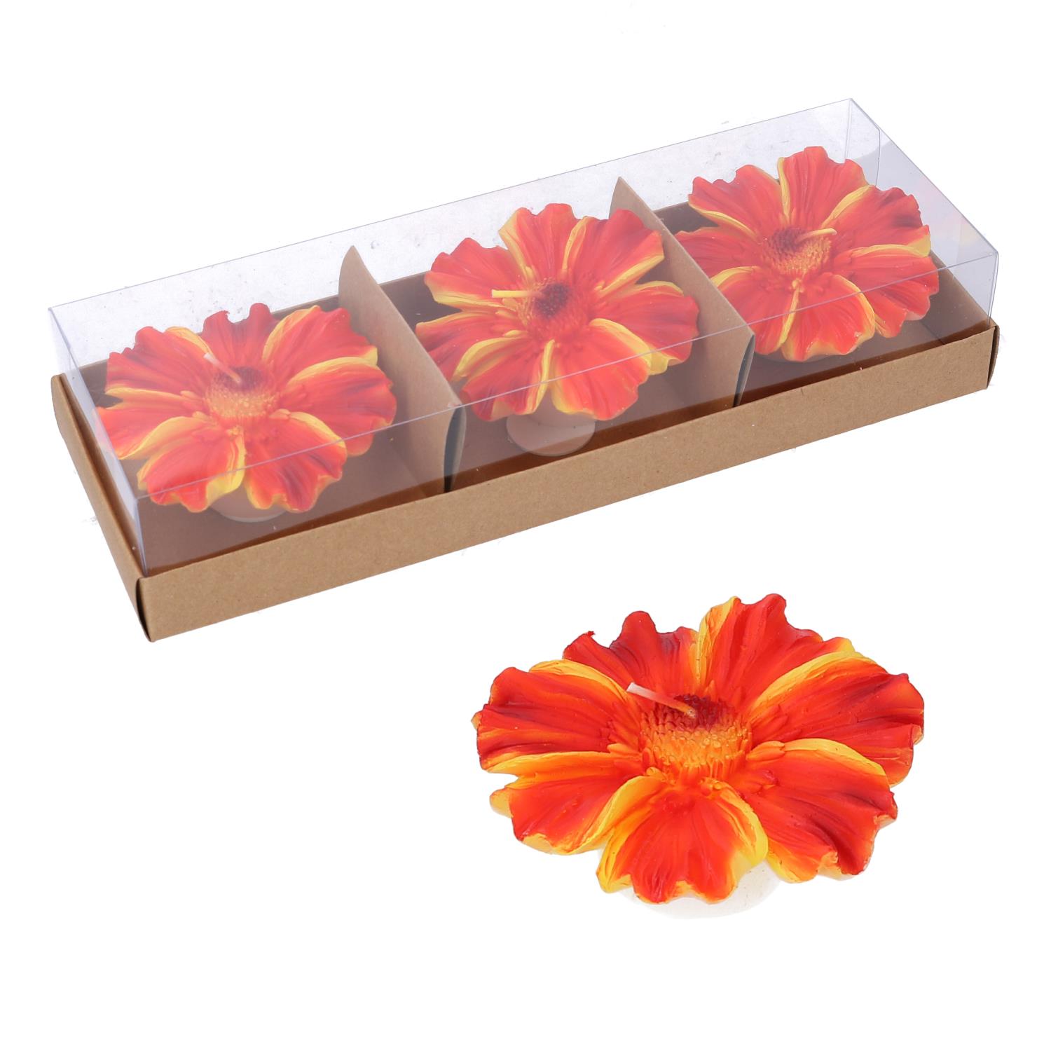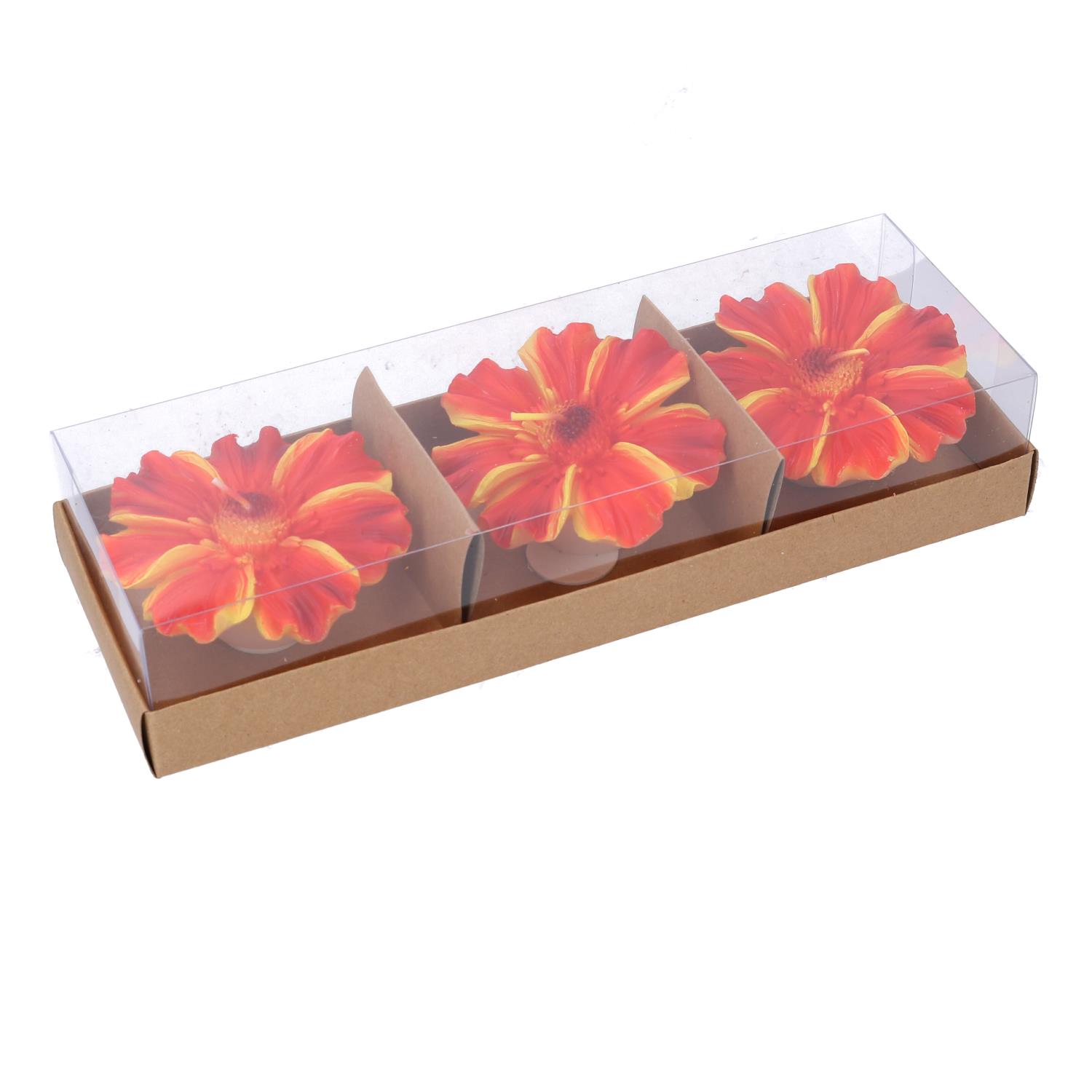 - Descrizione: Candela realizzata in paraffina, confezione da 3 pezzi a forma di fiore arancione. Dimensioni: cm 25,5×8,5×4,5.