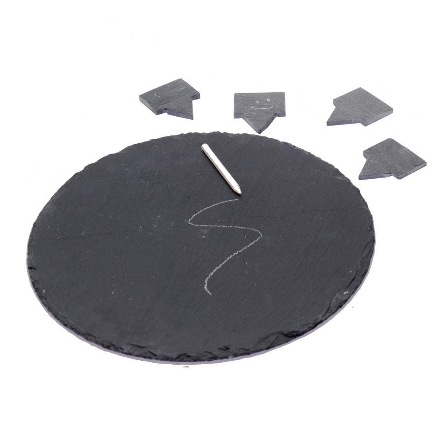 Piatto ardesia tondo con 4 targhette fumetto cmø30h0,5. CON GESSO