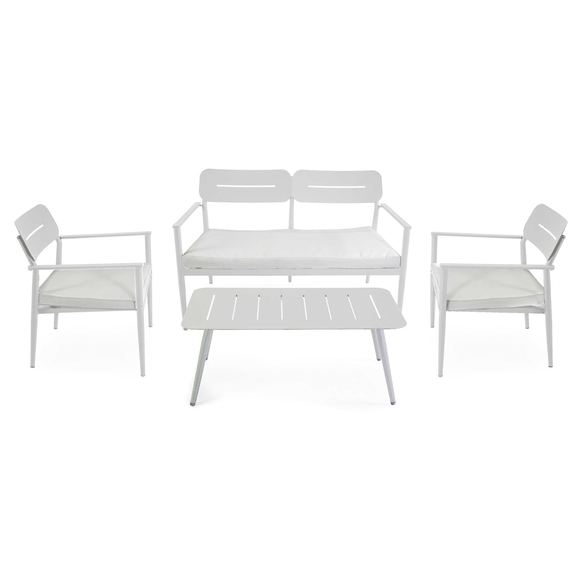 La struttura del salotto è realizzata in alluminio verniciato a polvere di colore bianco. I cuscini della seduta sono in poliestere con uno spessore di 5cm. Il top del tavolo è composto da doghe in alluminio.