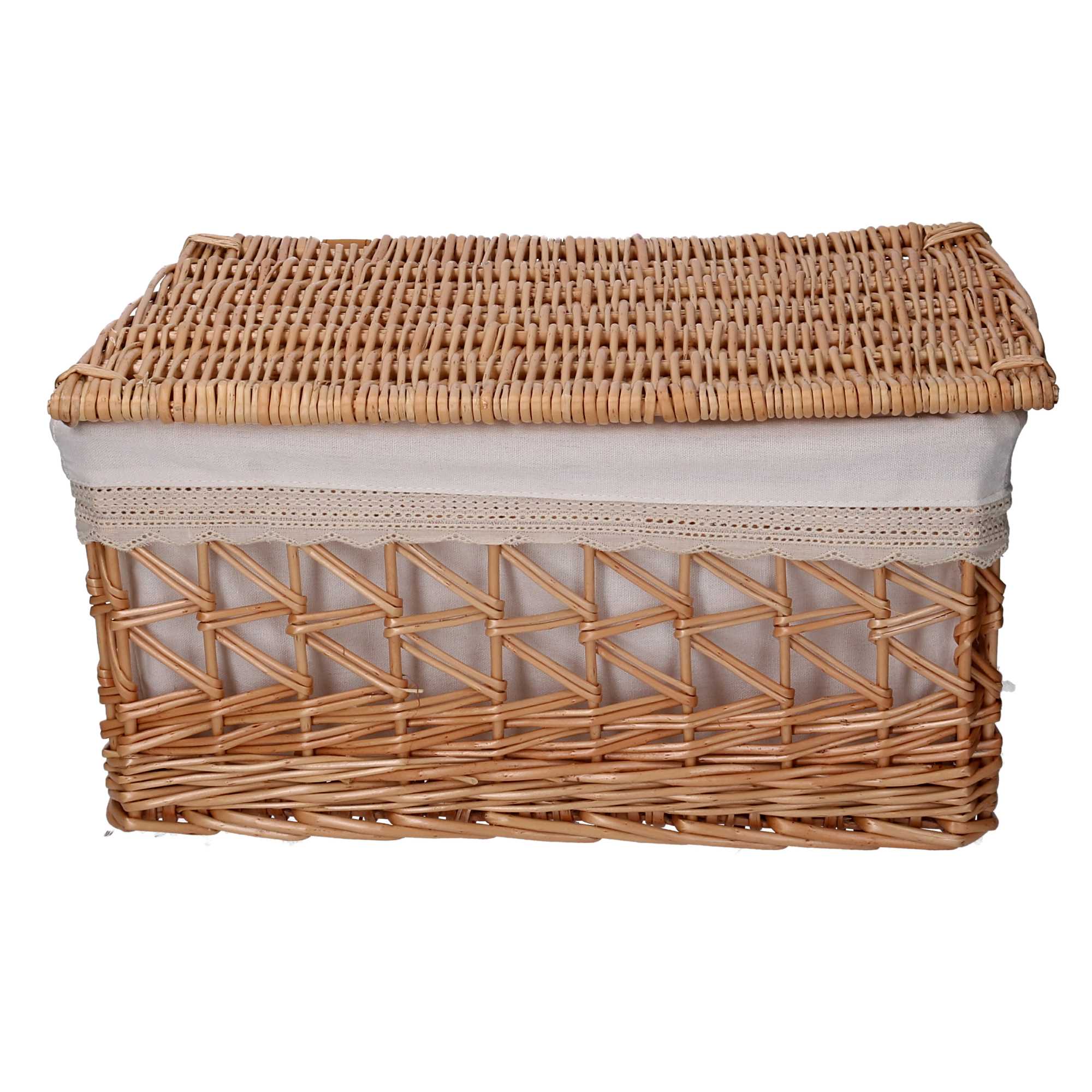 Scatola vimini fodera pizzo con coperchio 1-3 rettangolare cm42x31h19. CON COPERCHIO